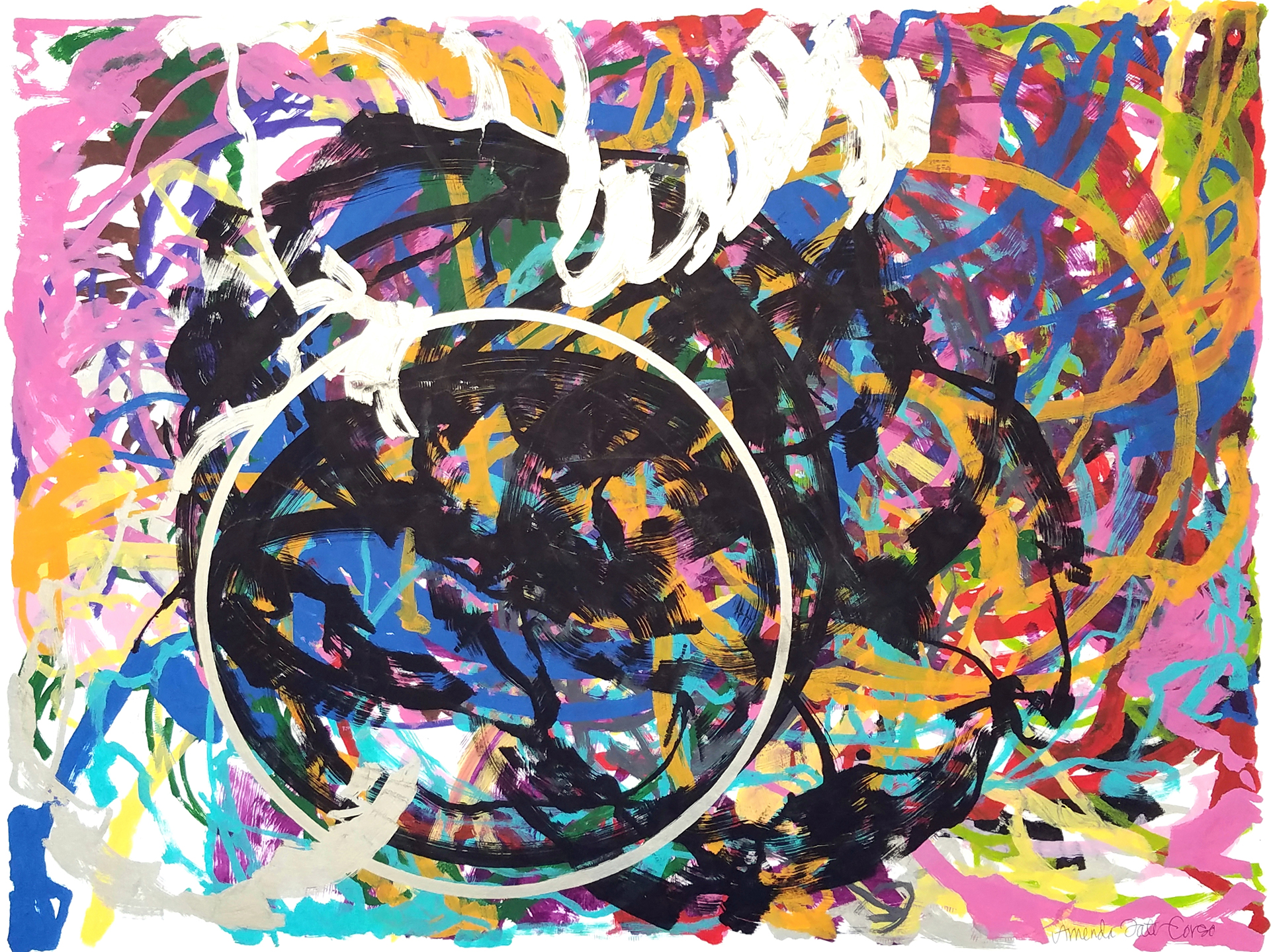 This is a collaborative work of art created at the Science Center of Iowa during the Maker Faire. Attendees were invited to become participants by selecting a paint color and dancing to instruct the Manibus paint bot to add their contribution to this collective and layered work of art. Acrylic on Paper mounted on wood panel. 18″x24″