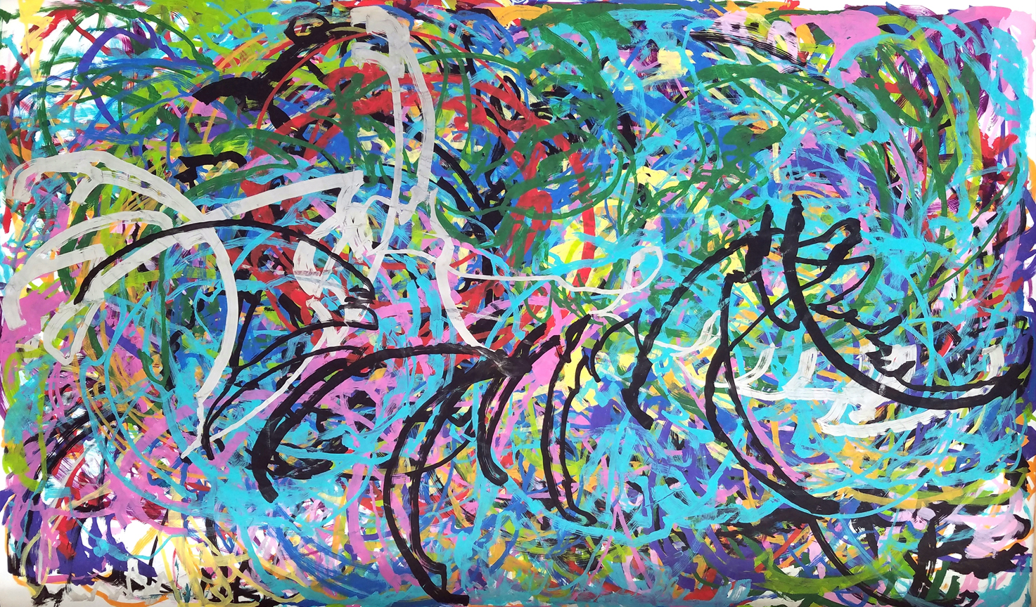 This was created collaboratively at the Science Center of Iowa’s Maker Faire. 142 attending participants contributed to the layered work of art by selecting a color and wearing the motion-sensing control device while dancing to instruct the Manibus paint bot to add to the painting. It is acrylic on paper and measures 24″x40″